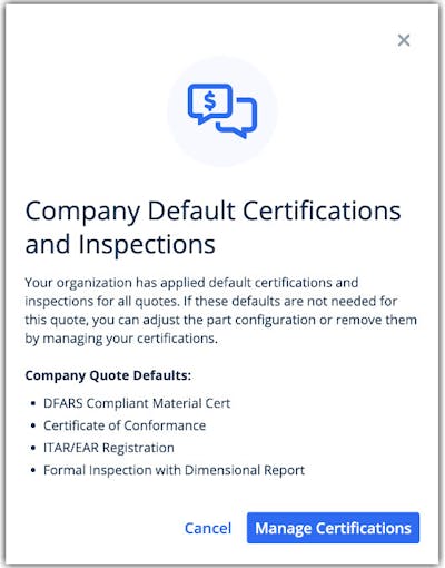 This is especially useful for teams that adhere to company or project-specific inspection and certification requirements. Setting a quote preset will ensure team quotes have the correct requirements applied by default, resulting in fewer purchasing discrepancies and post-order corrections.